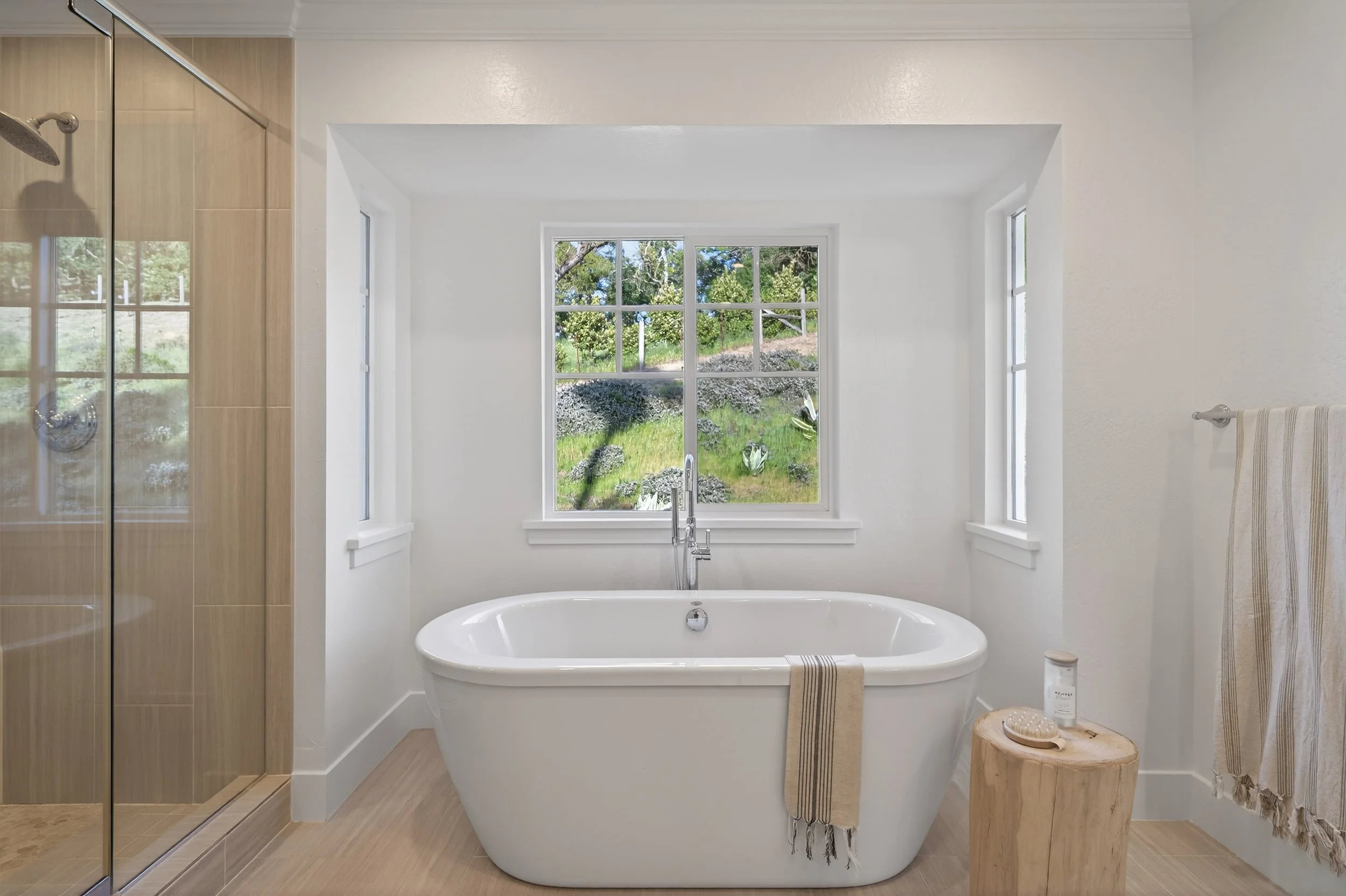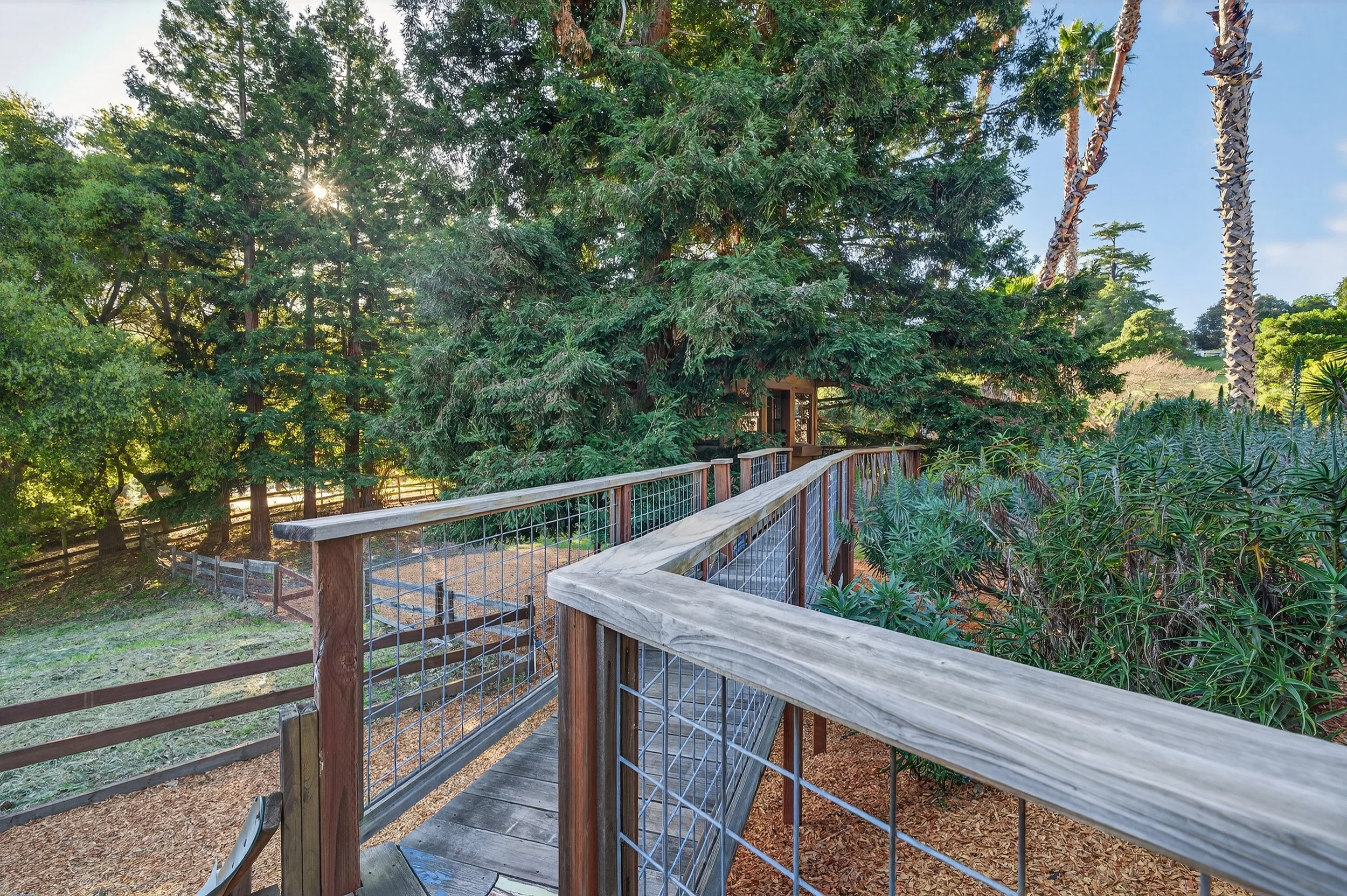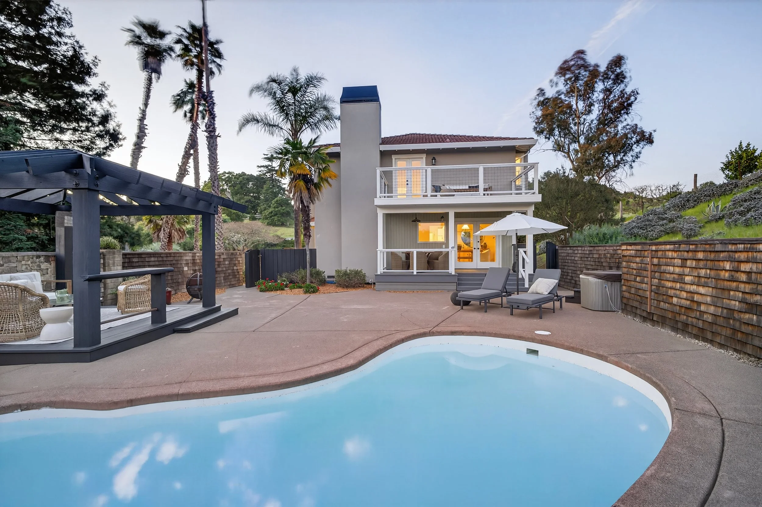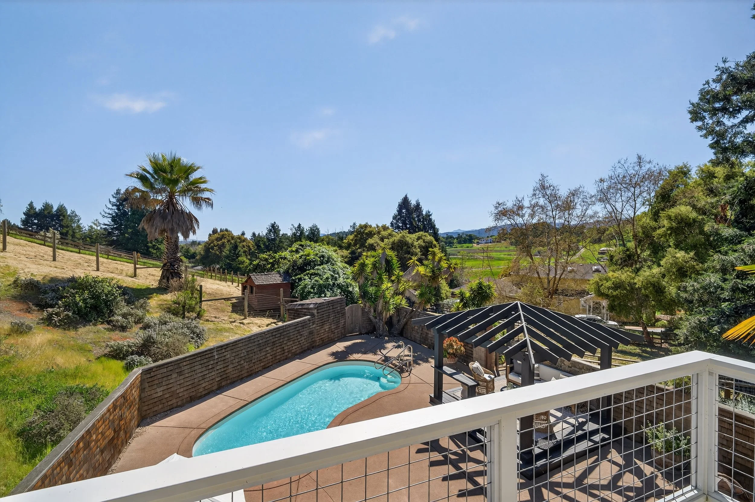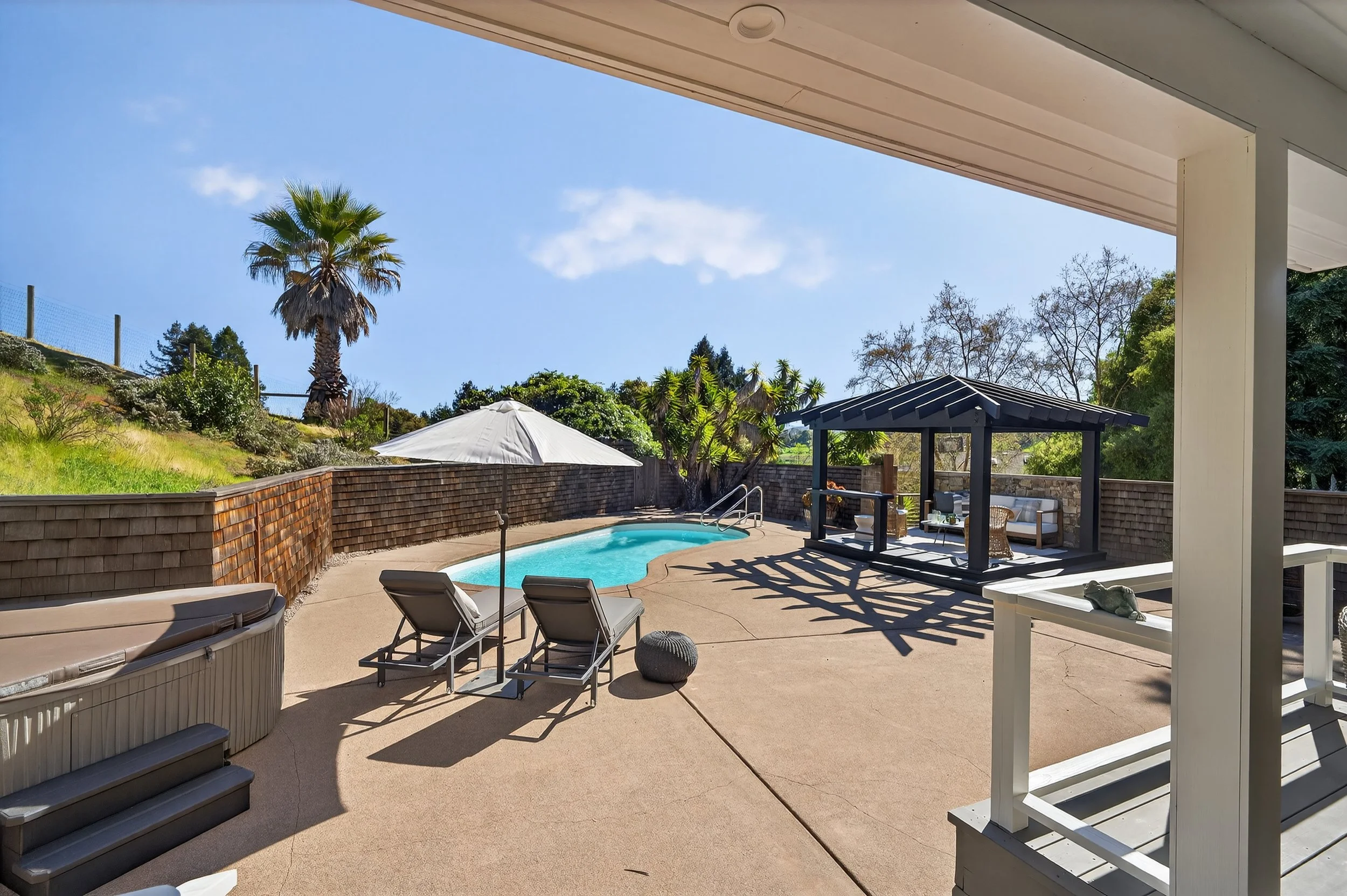 The kitchen is open and functional, centered around marble counters, a Wolf gas cooktop, KitchenAid refrigerator, wine fridge, dishwasher, and a large farmhouse sink. A bar counter with seating for two adds casual dining space, while a walk in pantry keeps everything organized. Upstairs, four bedrooms include a spacious primary suite with views, a private balcony overlooking the pool with views of Mount Tam, walk-in closet, and a large bath with soaking tub, water closet, double vanity, and dual shower heads. The lower level includes an additional bedroom with its own bathroom set slightly apart, creating a private enclave ideal for guests or extended family. Outdoors, the pool, gazebo, and even a custom tree house create a setting that feels both relaxed and perfect for creating memories. The grounds continue with plenty of yard space for gardening, animals, or extending the backyard for entertaining.
