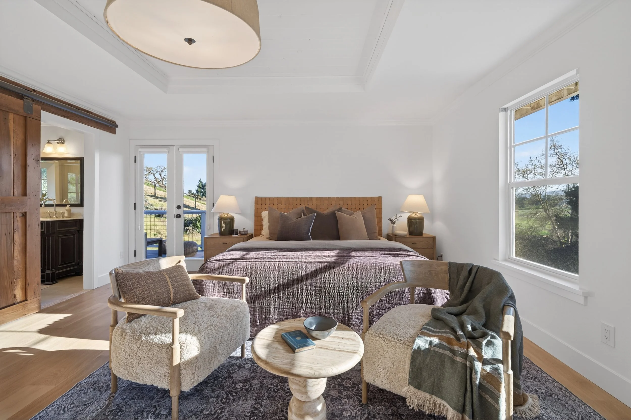 Spacious primary suite with balcony overlooking pool