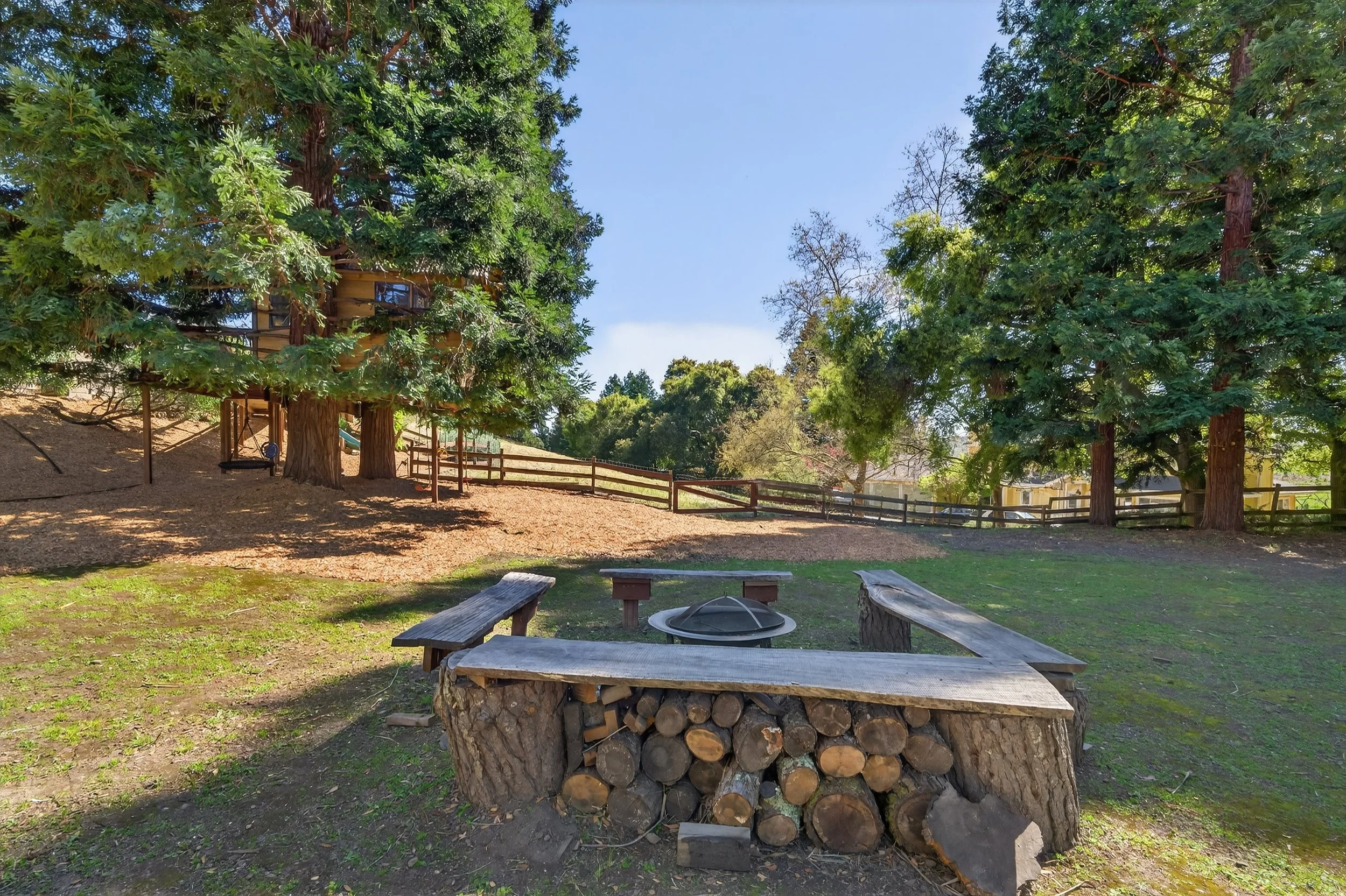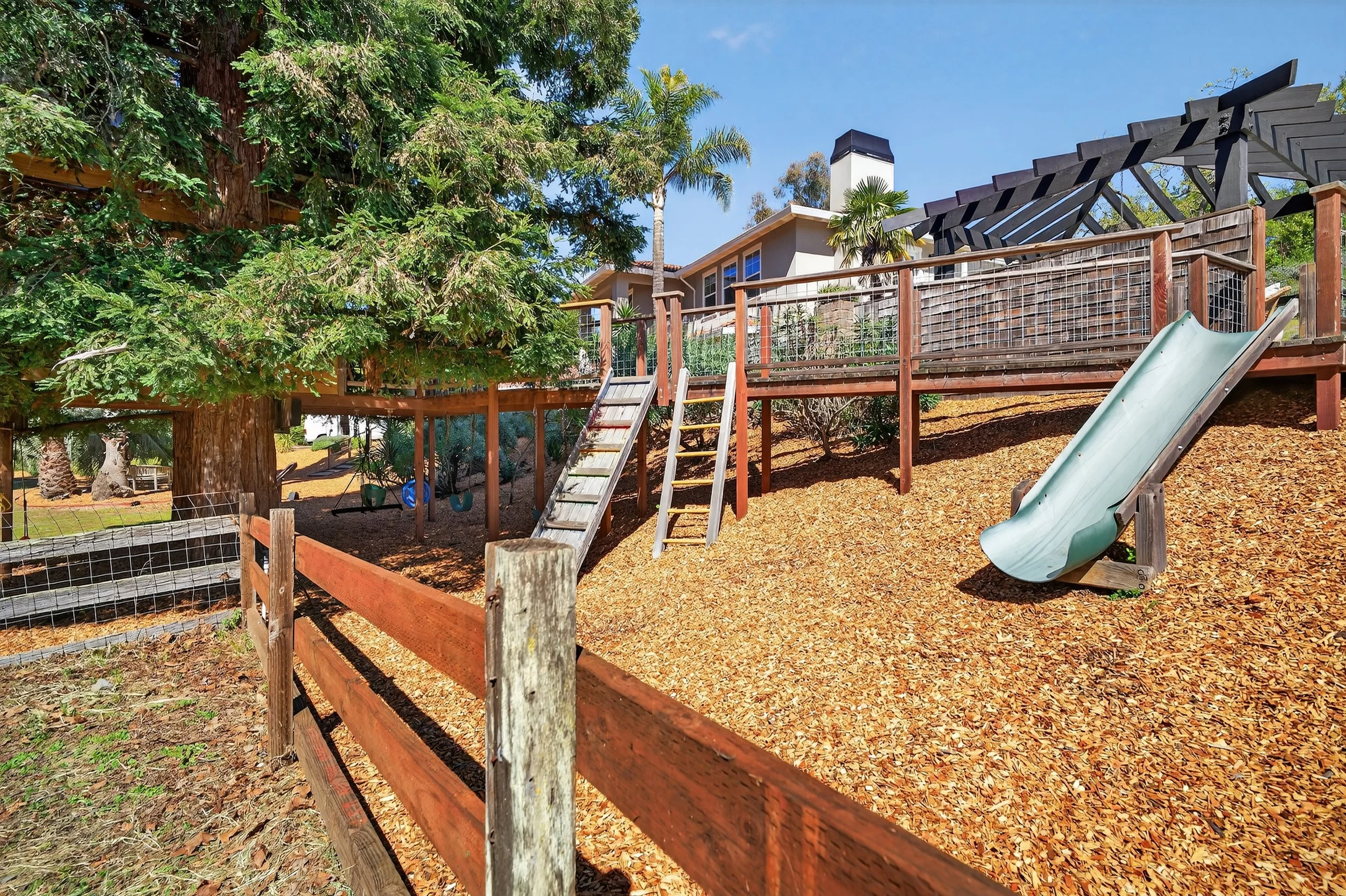 Custom tree house with swings and slide